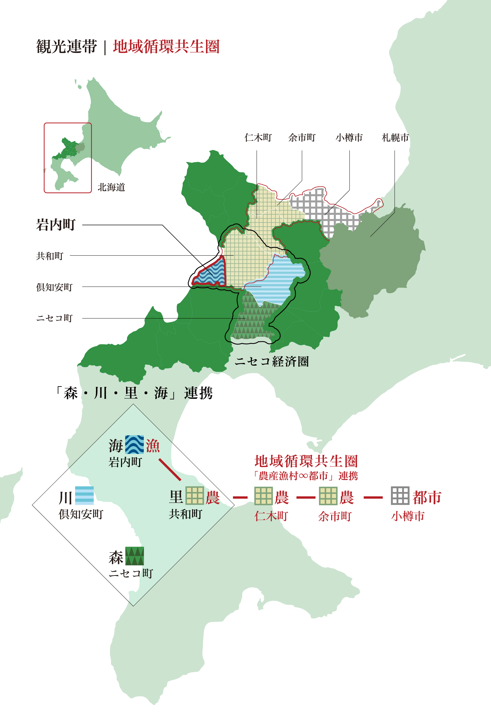 プロジェクトは、「ニセコ町(森)ー倶知安町(川)ー共和町(里)ー岩内町(海)」という森・川・里・海をつなぐ連携と、「岩内町(漁)ー共和町(農)ー仁木町(農)ー余市町(農)ー小樽市(都市)」という農山漁村と都市をつなぐ連携を合わせた“地域循環共生圏”の確立を目指す。